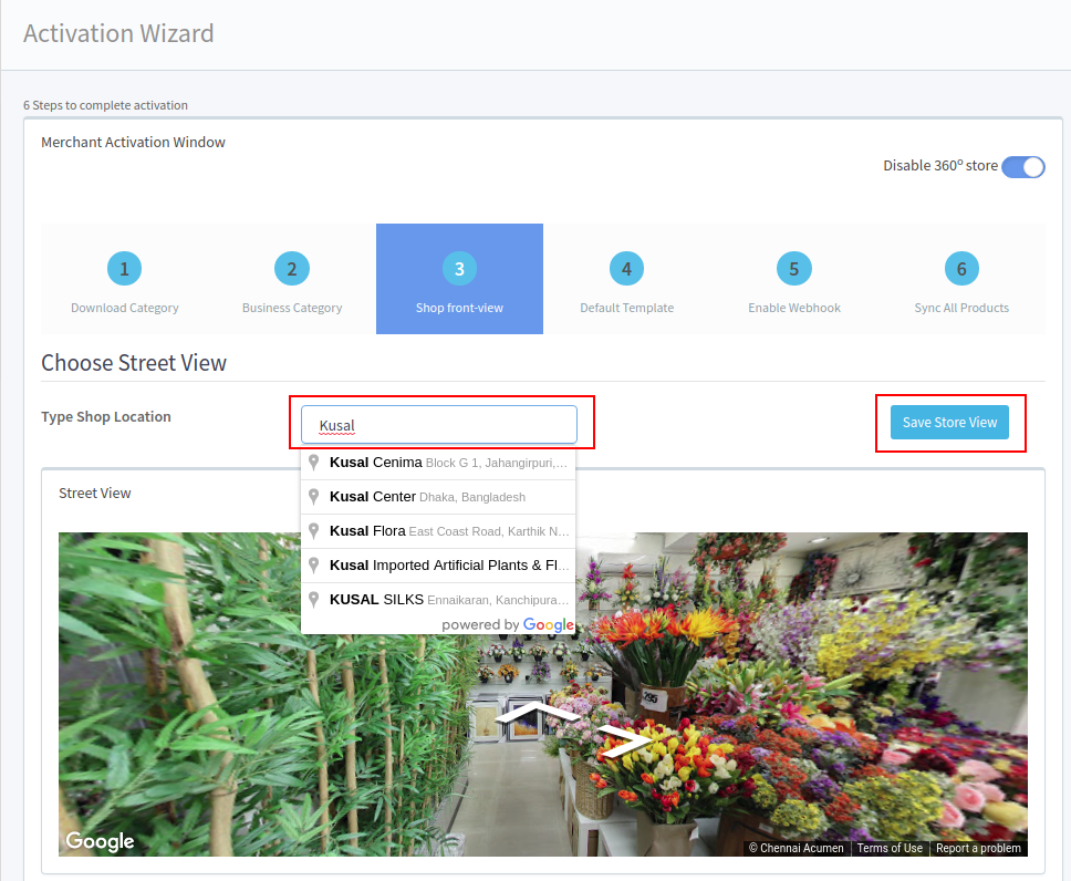 13. Enter your store street view in the text box then save the store view, as it is shown below then click the 3rd step